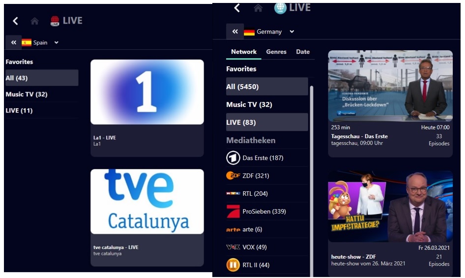 Watch live television from different countries. Check out their different channel to feel like a local or closer to home. Some of the countries even offer to watch shows on-demand sorted by genre like kids, channel, movie, entertainment.