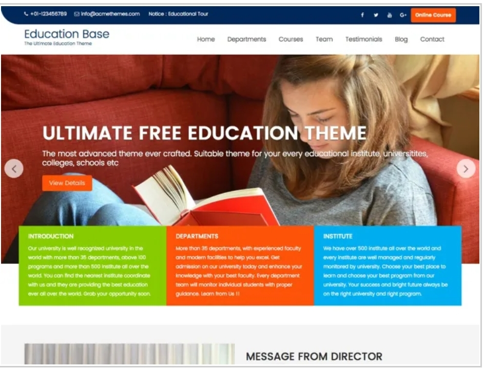 This educational theme has many features to help you design your educational website. It has awesome slider sections, header and footer options, layout design options, advanced color options, widget options, custom copyright options, integrated social icon options, notice bar options, etc. This means that you can easily customize it to the way that fits your website.