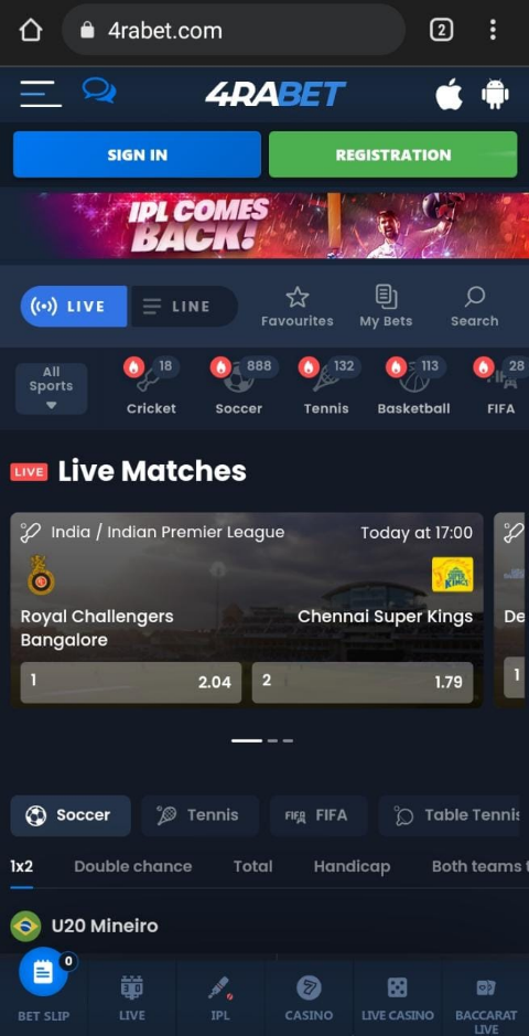 - The Sportsbook: There are multiple games to wager on including the most popular games. Indians have a reason to smile as 4rabet app offers the best cricket odds and they also have lots of bonuses onboard. All football games are covered; EPL, Spanish Laliga, and Seria A are all-inclusive.
