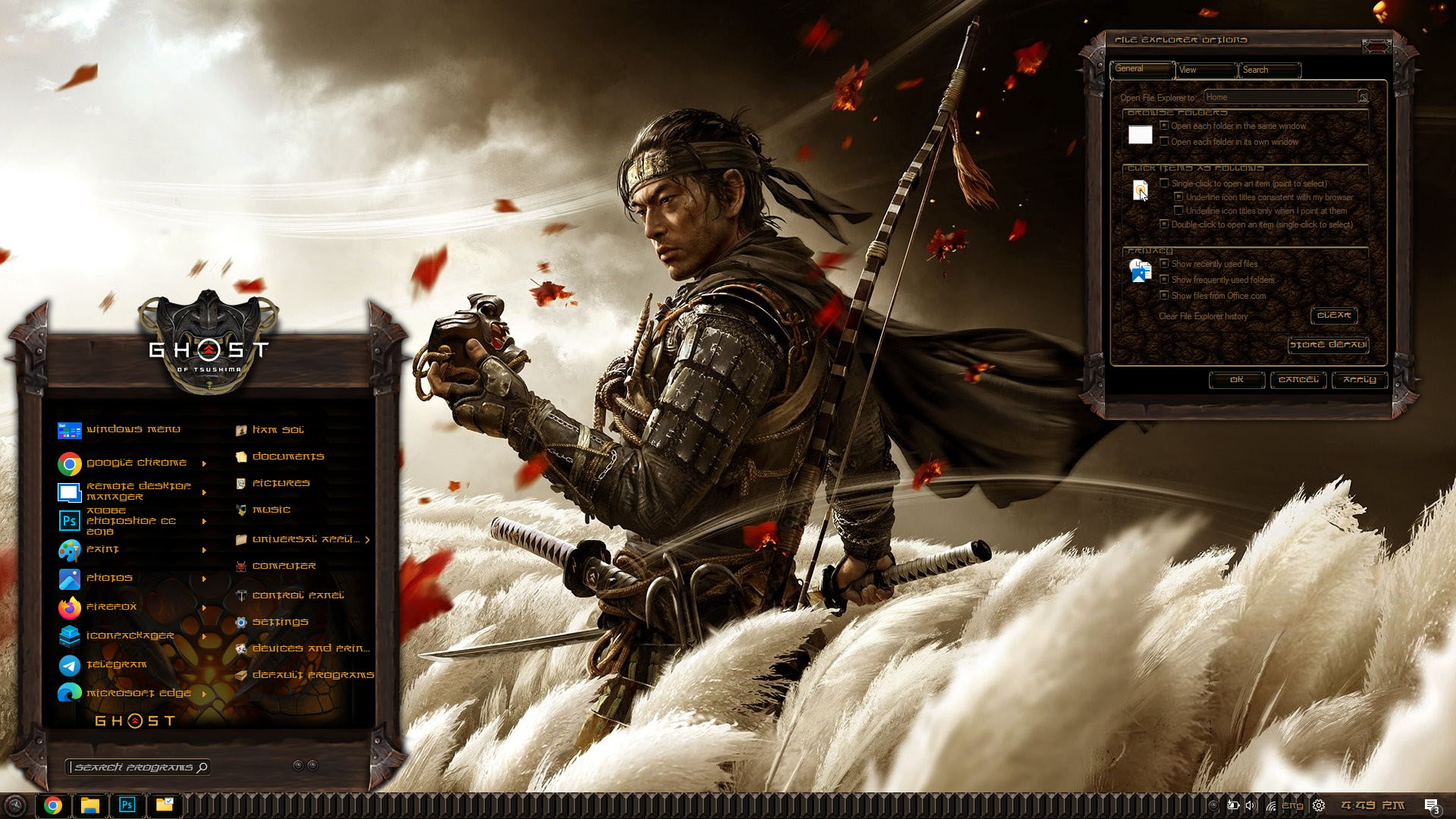 GHOST OF TSUSHIMA Premium Skin Pack are about to change the look of your Windows theme! The new version of GHOST OF TSUSHIMA Premium Skin Pack is here now! the best experiences of GHOST OF TSUSHIMA Premium in WindowBlinds. in this new version we update many parts of theme pack, now the skin pack will transform your Windows to GHOST OF TSUSHIMA Premium just in a few minutes, we update many things, Hope you like this new skin pack and enjoy it.