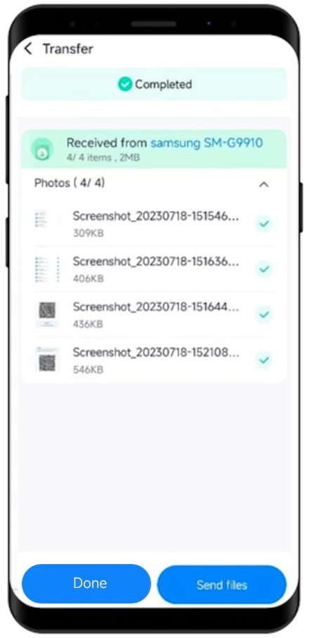 Once the connection is established, the transfer process starts between the sender and receiver device. A “Completed” notification appears at the conclusion of the process, where you should tap “Done” to conclude the file transfer on your iPhone.