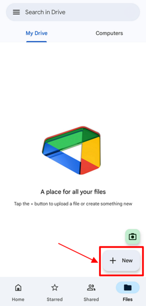 Step 1: Open Google Drive on your Android device and locate the “+ New” button on the screen.