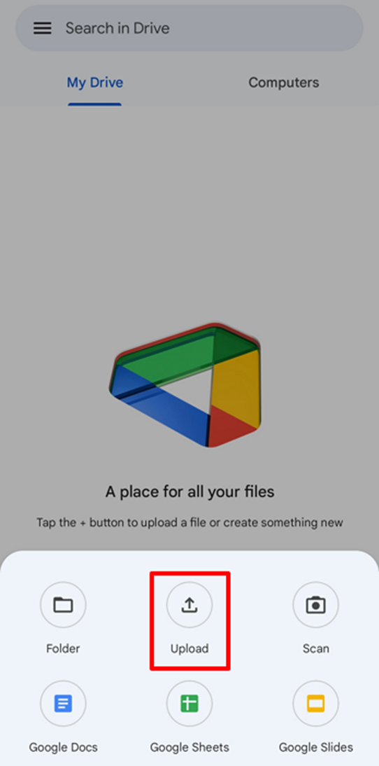 Step 2: From the list of options that pop up, tap the “Upload” option and select the files you wish to transfer to your iPhone. Once you select the files, Google Drive will automatically start synchronizing them, and you can see them across all connected devices.