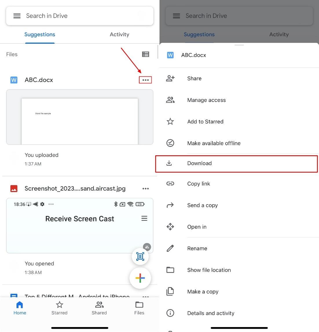Step 3: Open the Google Drive app on your iPhone and locate the files you just uploaded from the Android device. Tap the ellipses icon on the files and select “Download” from the menu to save them to your device.