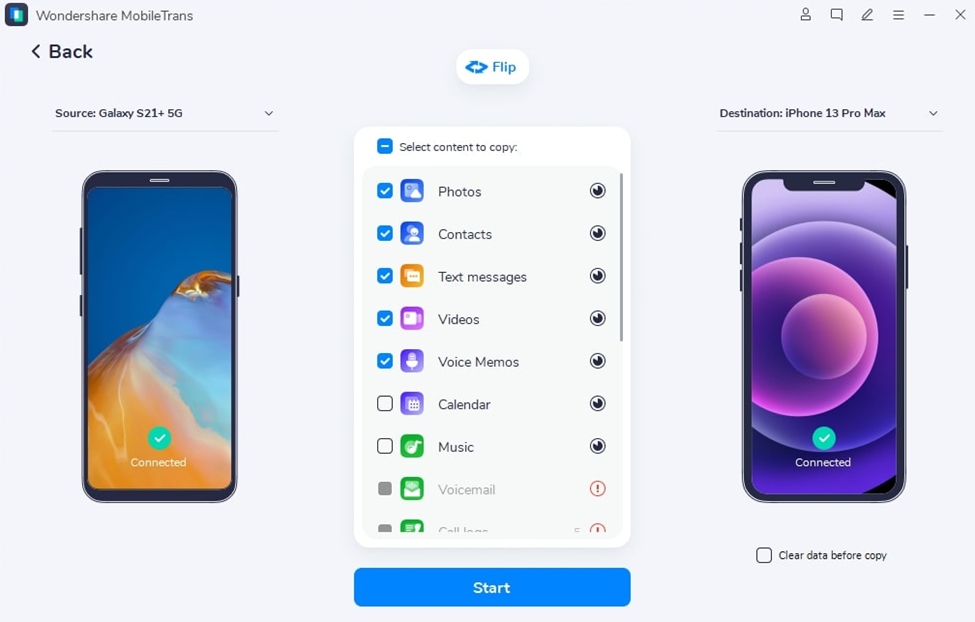 After selecting the positions of your devices, you will see a list of all the data files located on your Android phone. Simply check the boxes next to the ones you wish to transfer to your iPhone. Tap the “Start” button and wait until the process is complete to disconnect your devices and enjoy the data.