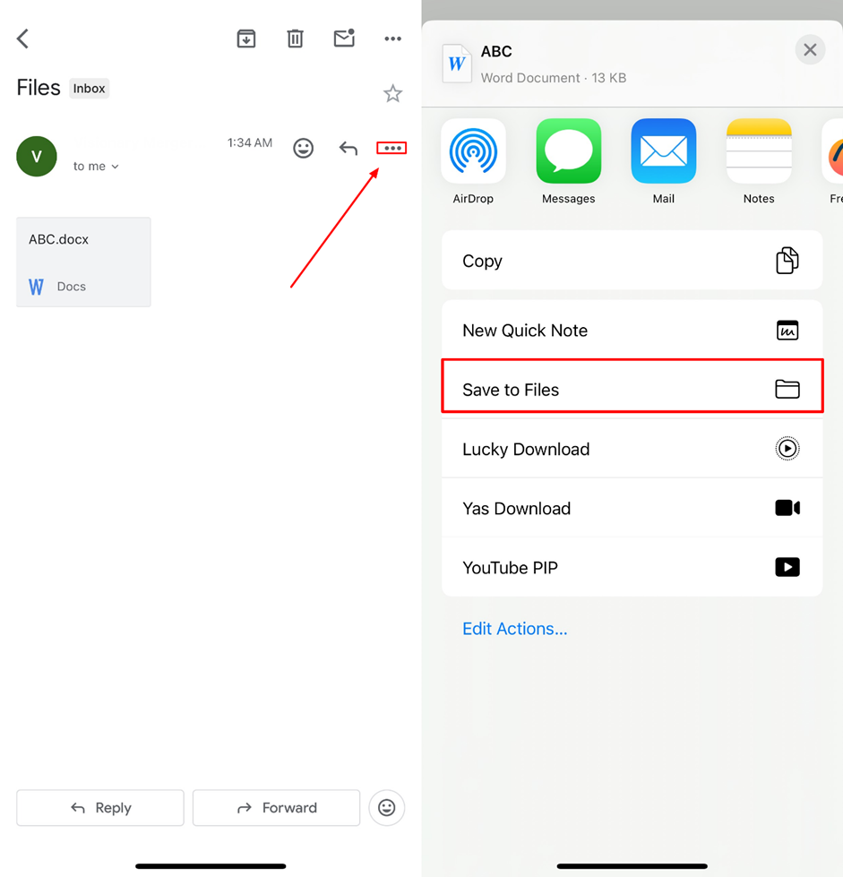 Step 4: Open Gmail on your iPhone and log in using the ID you just sent the email to. Open the email you received from your Android device and click on the files you sent to the iPhone. You now need to click on the menu icon to select “Save to Files” to export your files.