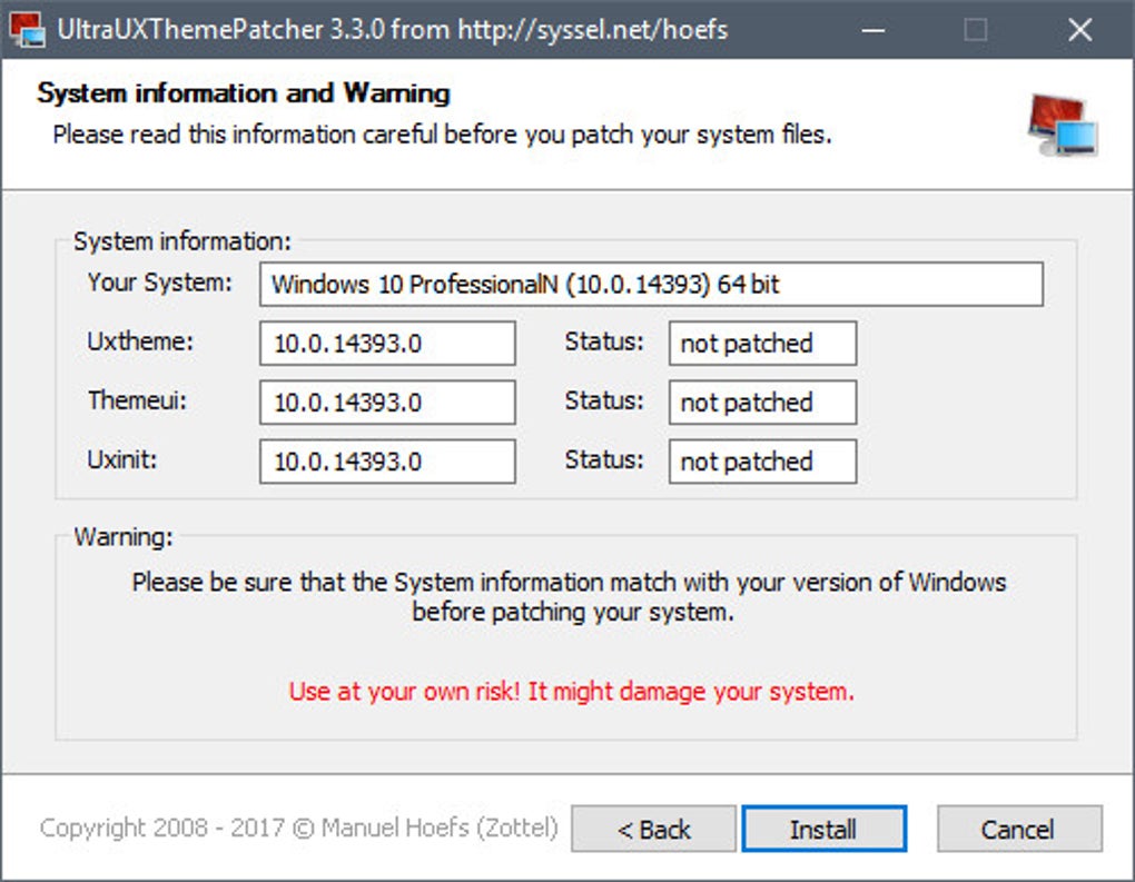 | In rare cases after a Windows Update, the patcher is not able to take ownership of the necessary files in c:\windows\system32 (uxtheme.dll, uxinit.dll, themeui.dll). Only solution today: Sign in as Administrator, take ownership to the 3 files and grant full authorization, reboot and afterwards use the patcher again as Administrator. The modification should work now. |