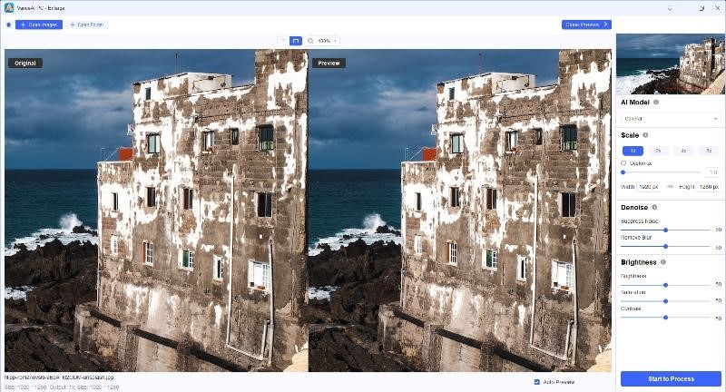 Step 3: Upload the image you want to enhance and select the desired settings or preferences. Click on Start to Process and then save the image using the options given.